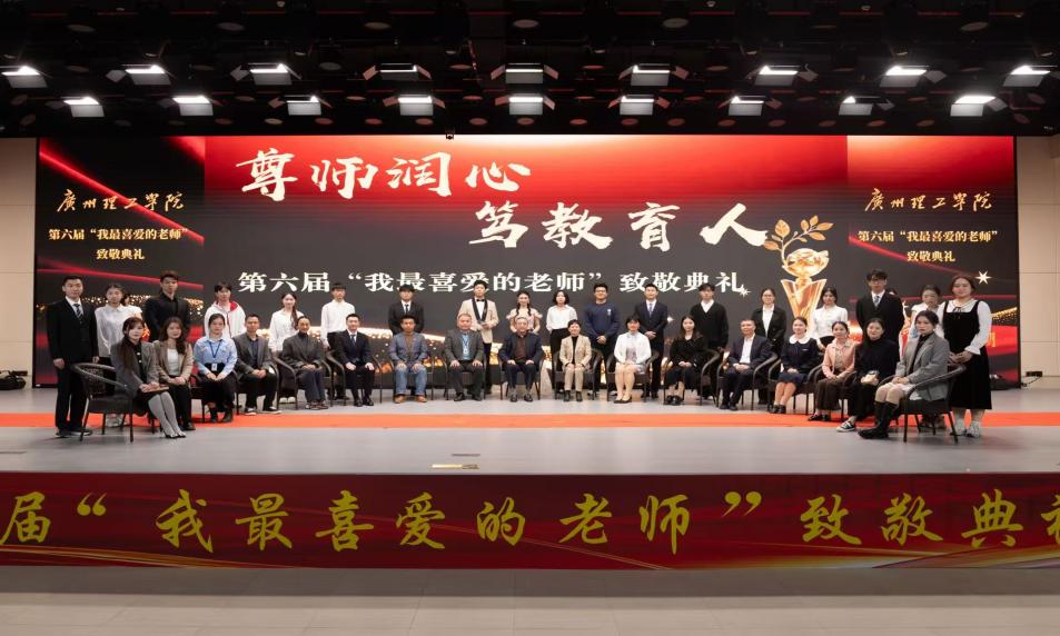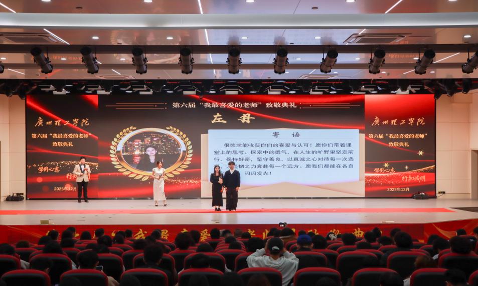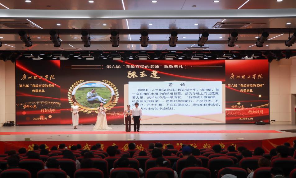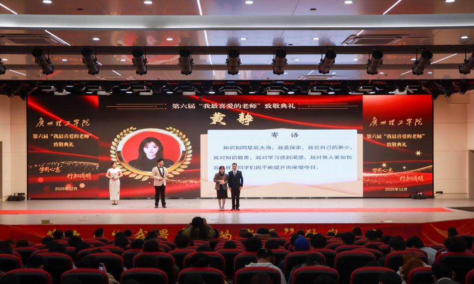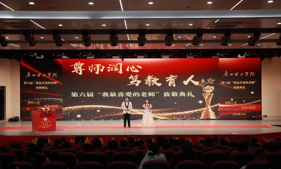 12月25日下午,广州理工学院第六届“我最喜爱的老师”颁奖典礼在1号报告大厅隆重举行。校长胡社军,副校长张世梅,党委副书记、副校长张志红及在惠州校区分会场的副校长肖海应邀出席,还有党委工作部、学生管理部、团委、各二级学院党团总支书记、学生代表参加典礼。