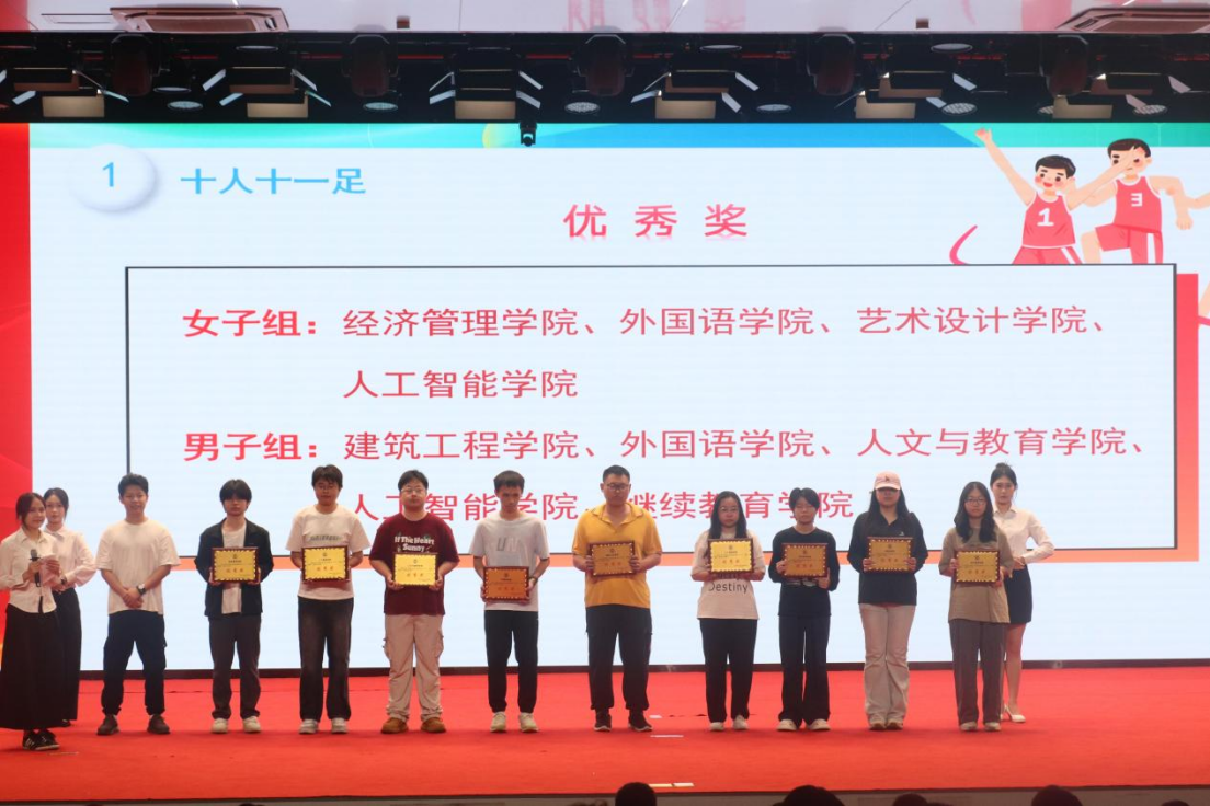 肖柳副书记宣读了本届体育节获奖集体与个人名单。本届体育节历时两学期,覆盖足球、篮球、羽毛球、乒乓球、十人十一足、环校接力跑等多个项目。经过激烈角逐,共决出各赛事一、二、三等奖及优秀奖、最有价值球员、最佳射手、最佳组织奖、道德风尚奖等荣誉。与会嘉宾依次为获奖代表颁发证书,现场掌声如潮。