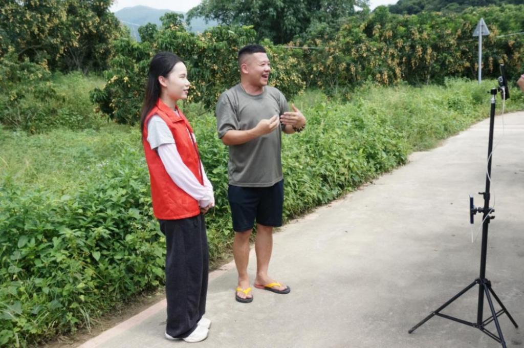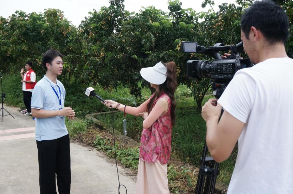 7月15日,在“新农人”代表邱利伟(潮州市松柏网络科技有限公司负责人)的指导下,实践团在径中村黄皮果园开展了一场别开生面的直播助农活动。从设备架设到话术设计,邱利伟手把手教学,队员们快速掌握直播技巧。“家人们看这个黄皮,果肉饱满多汁……”队员们轮番上阵,从采摘到品鉴全方位展示黄皮品质,从介绍产品特色到即兴创作“黄皮打油诗”活跃气氛,再到独立应对“如何下单”等观众提问。活动从最初的示范教学逐步过渡到学生独立直播,呈现了一场精彩的“传帮带”助农实践。此次活动得到饶平县广播电视台全程跟拍,吴明俊主任亲临指导。指导老师关俊文受邀接受电视台采访时表示:“我们希望通过‘高校+农户+直播’的模式,搭建可持续的农产品销售渠道。更期待在这个平台上,让广理人讲述饶平农产品的故事——这不仅能让钱东黄皮走向更广阔的市场,更是学生们将知识转化为实践能力的重要机会。我们还要践行‘学用心志,行知诚明’的校训,让青春足迹遍布饶平大地,实现农户增收、学生成长、乡村共赢。”