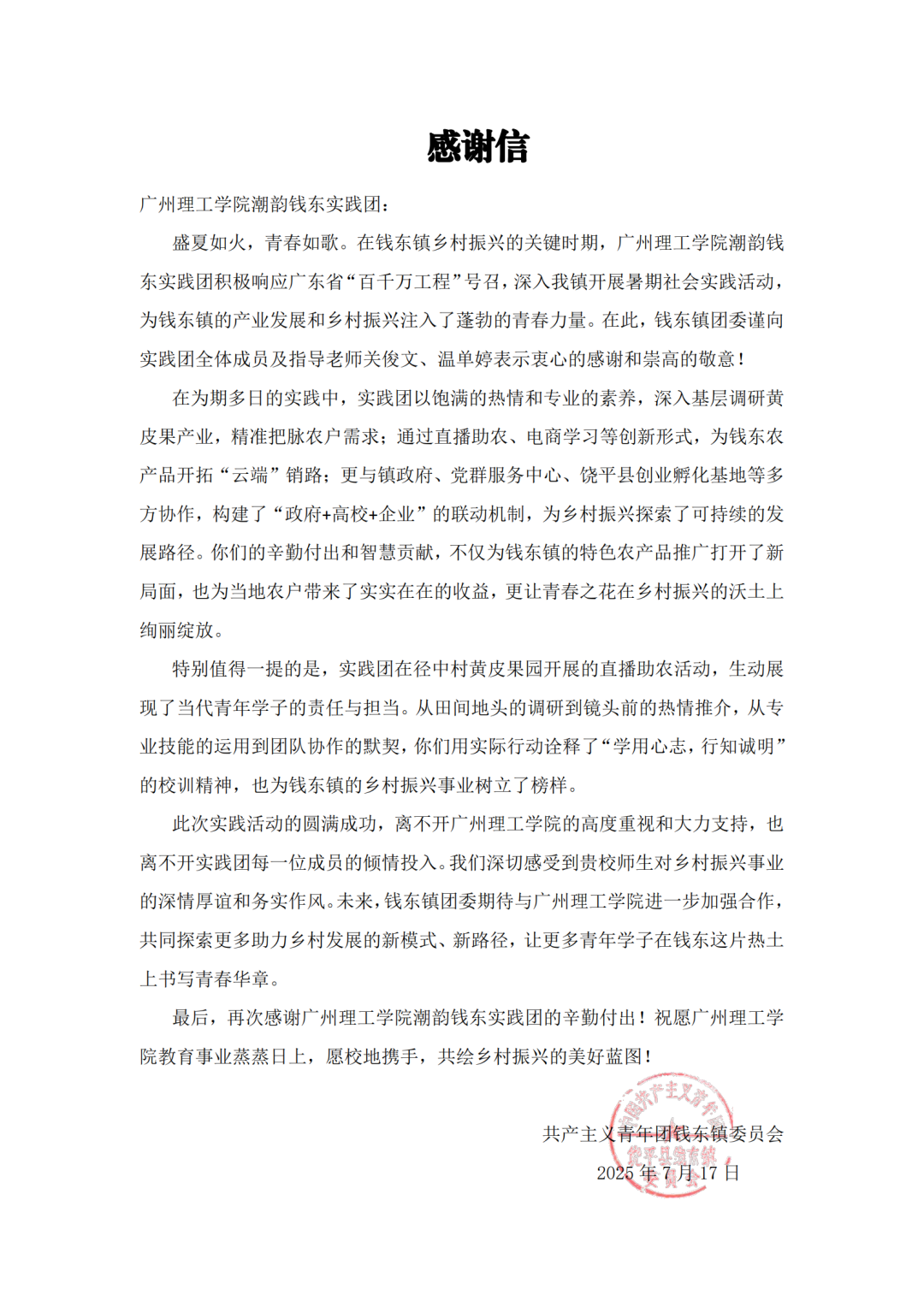 7月17日,共青团钱东镇委员会特地发来感谢信,对实践团的创新举措与责任担当予以高度赞扬。感谢信中特别提到,实践团的行动生动诠释了广州理工学院“学用心志,行知诚明”的校训精神,并表达了对未来深化与广州理工学院合作、共绘乡村振兴美好蓝图的殷切期待。