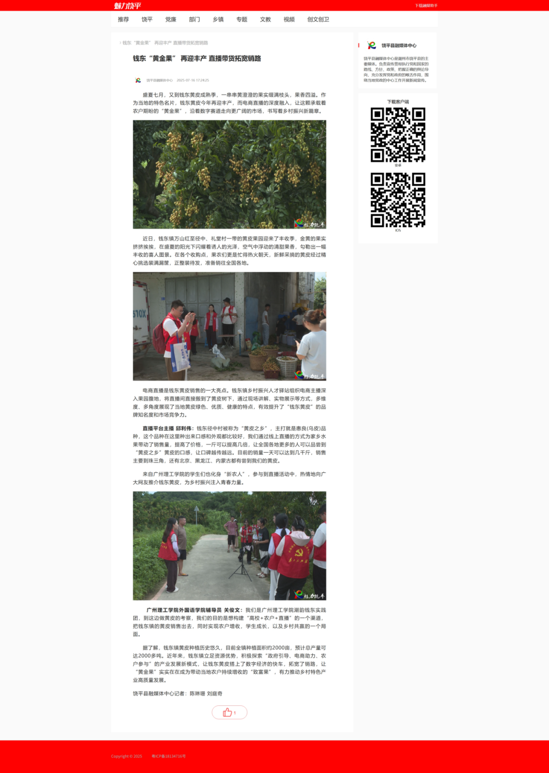 7月16日,广州理工学院潮韵实践团通过新媒体技术推广地方特色农产品的创新实践获得饶平县融媒体中心专题报道。