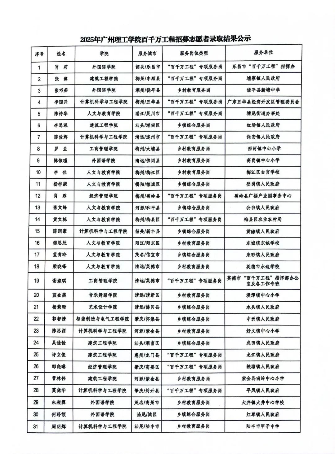 2.广州理工学院西部计划(含百千万工程)项目办将根据省项目办分配的实施规模确定招录名额,根据招募考试总成绩,综合政治面貌、用人单位需求、体检及心理测评合格等条件,确定2025-2026年度大学生志愿服务百千万工程志愿者拟录取名单,报省项目办审批,最终入围名单由省项目办公示。