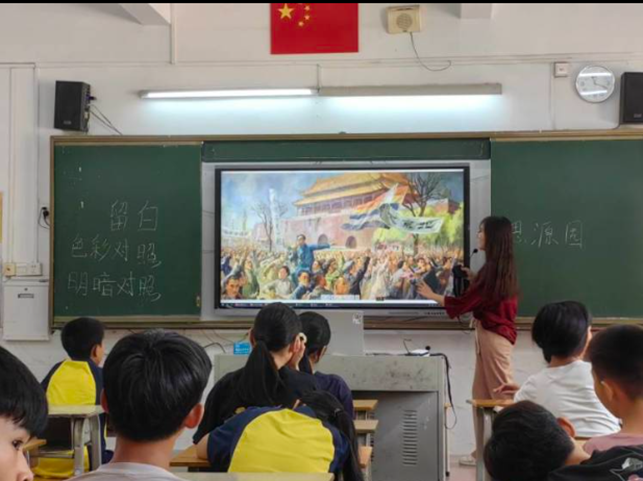 为了加强义务教育阶段学生们的爱国主义教育,让学生们更好了解中国近代革命先辈们的故事。支教团成员在课程中深入剖析中国近代史上的经典美术作品,通过讲解作品的创作背景、艺术风格及技法特点,让学生深刻体会到中国传统绘画中所描绘地近代的变革与发展,引领学生跨越时空,感受中国近代这个波澜壮阔时代的艺术作品所蕴含的精神和情感。