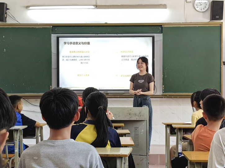 为培养同学对聋哑人群的理解尊重、增强社会责任感和关爱意识,了解手语的重要性、拓宽文化认知,志愿者授予同学们简单手语知识,并播放《我和我的祖国》手语操视频,热情教授。过程中,同学学到手语知识,感受爱国情怀和民族精神,表示要化感动为动力,努力成为优秀青年,为祖国贡献力量。