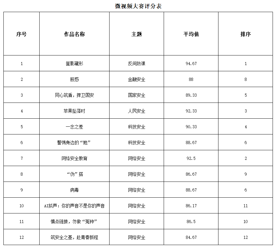 为推动国家安全宣传教育在高校广泛深入开展,增强广大高校师生国家安全意识,我校积极组织参与2026年国家安全教育微视频大赛。经校内评审,作品得分及排名如下: